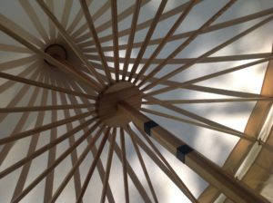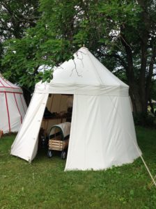 I use the hub & spoke structure. I have good evidence for its being an authentic period practice, and it is extremely functional. If you desire a rope supported round tent (which is also undoubtedly a period practice), I’d be very happy to make you one. I just feel that the hub and spoke version is superior for most situations so it’s my standard version.
