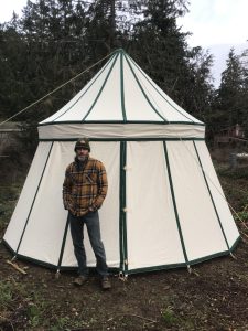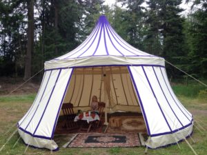 Absolutely the best round pavilion I know how to make. Every detail lavished… Narrow panels for more strength and more stakes… Latigo leather patches for stake loop reinforcements… Heavier weight center pole standard in the 18′ and larger sizes… Colored seam-stripes or similar decoration included at no extra cost. Curved roof panels standard… Wind-Ropes standard… Dust-Ruffle/Long stake-loop design makes for easy set-up on uneven ground… Stalwarts Stand Out in a crowd and Stand Up to weather that flattens much of the rest of the camp. Exact details vary because each Stalwart is the state-of-the-art, as I know it, at the time it is made.