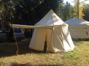 As with all my tents, two doors are standard. A splice in the center pole is also standard. This keeps all the poles under 7′ long. Removable walls are standard on hub&spoke round pavilions. Standard wall height is 6′ 9″ and walls slope outward 2′. Modifications to wall height and slope are possible, just contact me for a price.